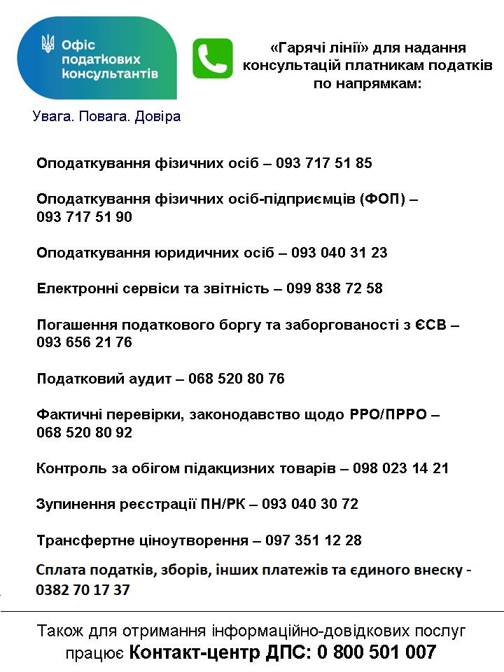 Для отримання інформаційно-довідкових послуг – Контакт-центр ДПС 0800 501 007