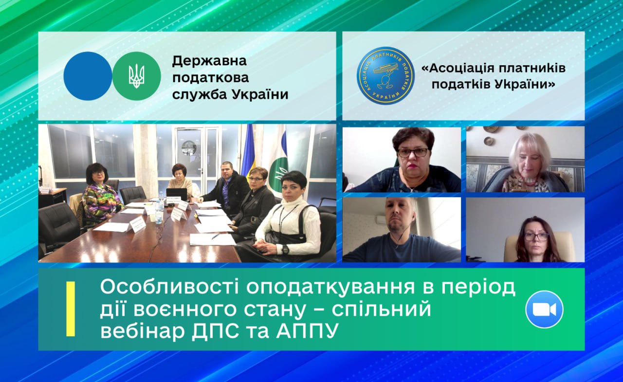 ДПС та Асоціація платників податків України продовжують серію спільних вебінарів для платників з актуальних питань оподаткування у період дії воєнного стану.