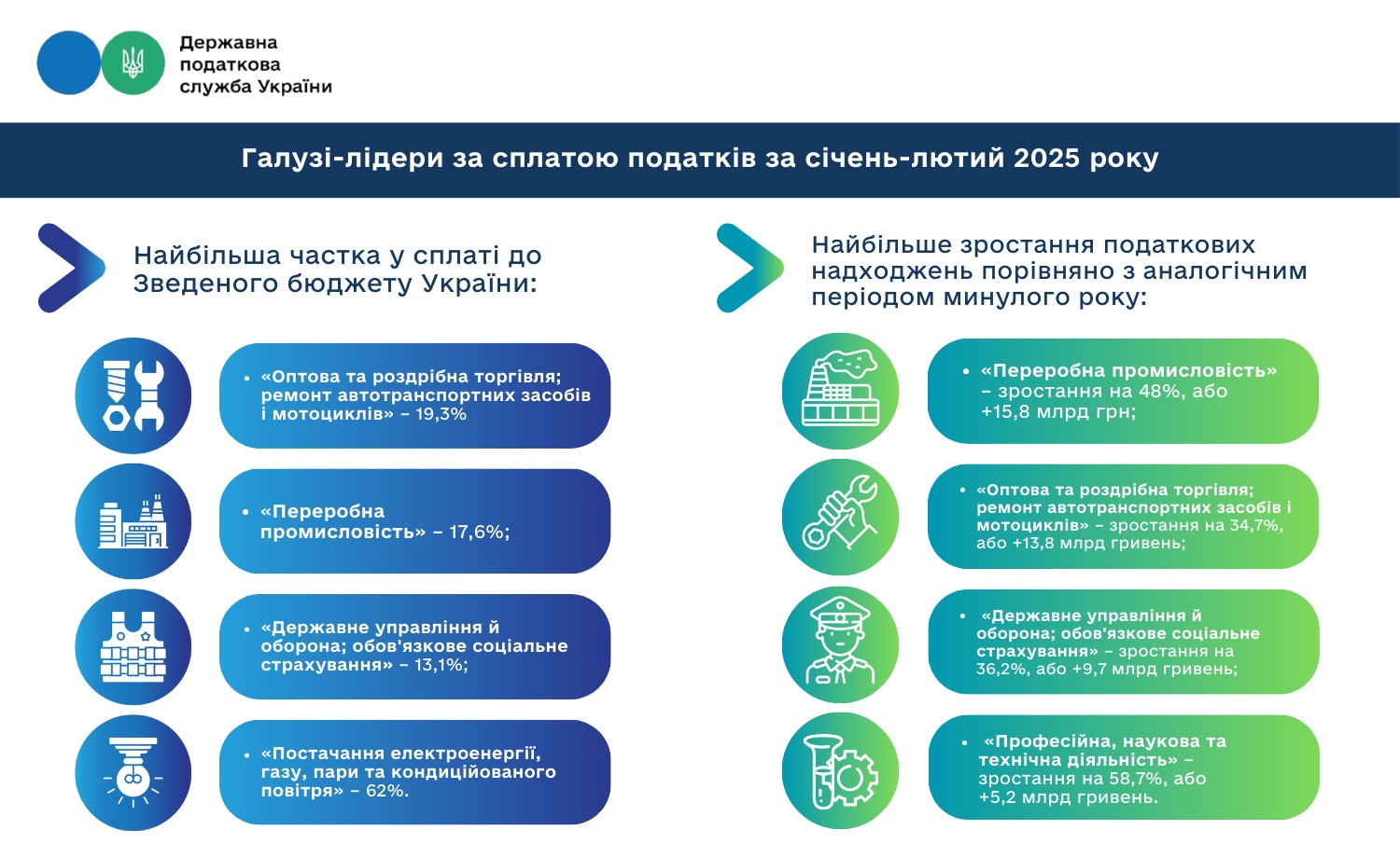 Порівняно з аналогічним періодом минулого року у січні – лютому 2025 року зафіксовано найбільше зростання сплати податків у таких галузях: