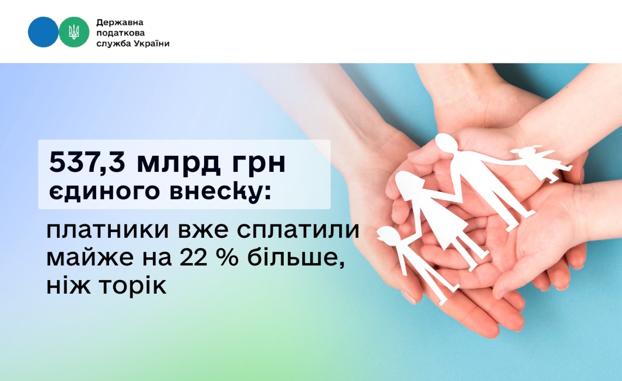 537,3 млрд грн єдиного внеску: платники вже сплатили майже на 22 % більше, ніж торік
