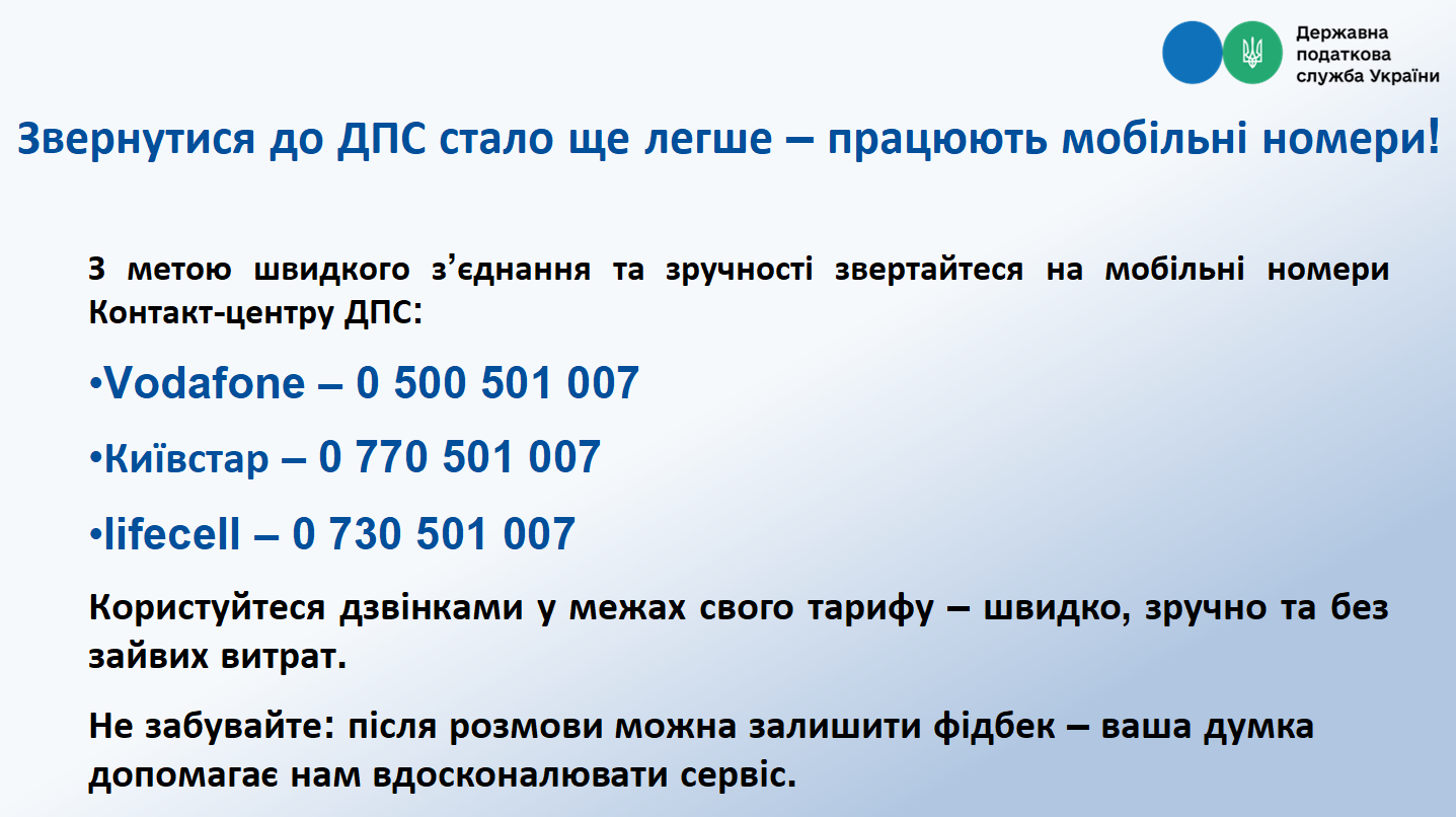 Для зручності громадян та бізнесу Контакт-центр ДПС працює з номерами мобільних операторів: