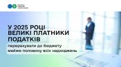 До Зведеного бюджету України у 2025 році від великих платників надійшло 953,2 млрд грн податків і зборів. Це складає 46,5 % від усіх бюджетних надходжень, які адмініструє податкова. Порівняно з 2024 роком надходження збільшились на 7,4 % (65,6 млрд гривень). Про це на своїй сторінці у Facebook повідомила в. о. Голови ДПС Леся Карнаух.